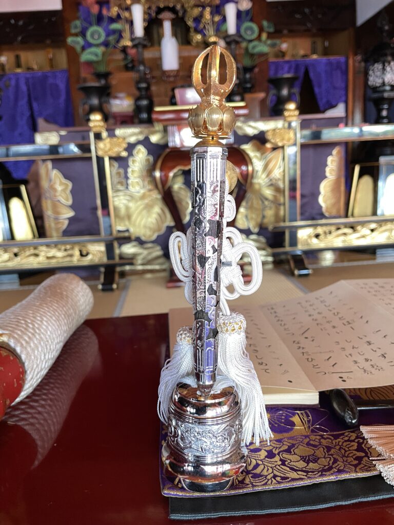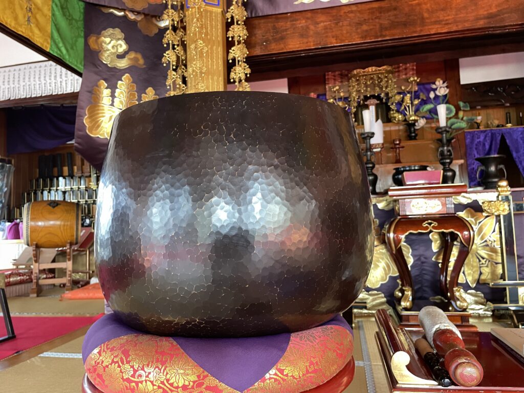 左手で鈴、右手で鉦を打ちながらお唱えします。